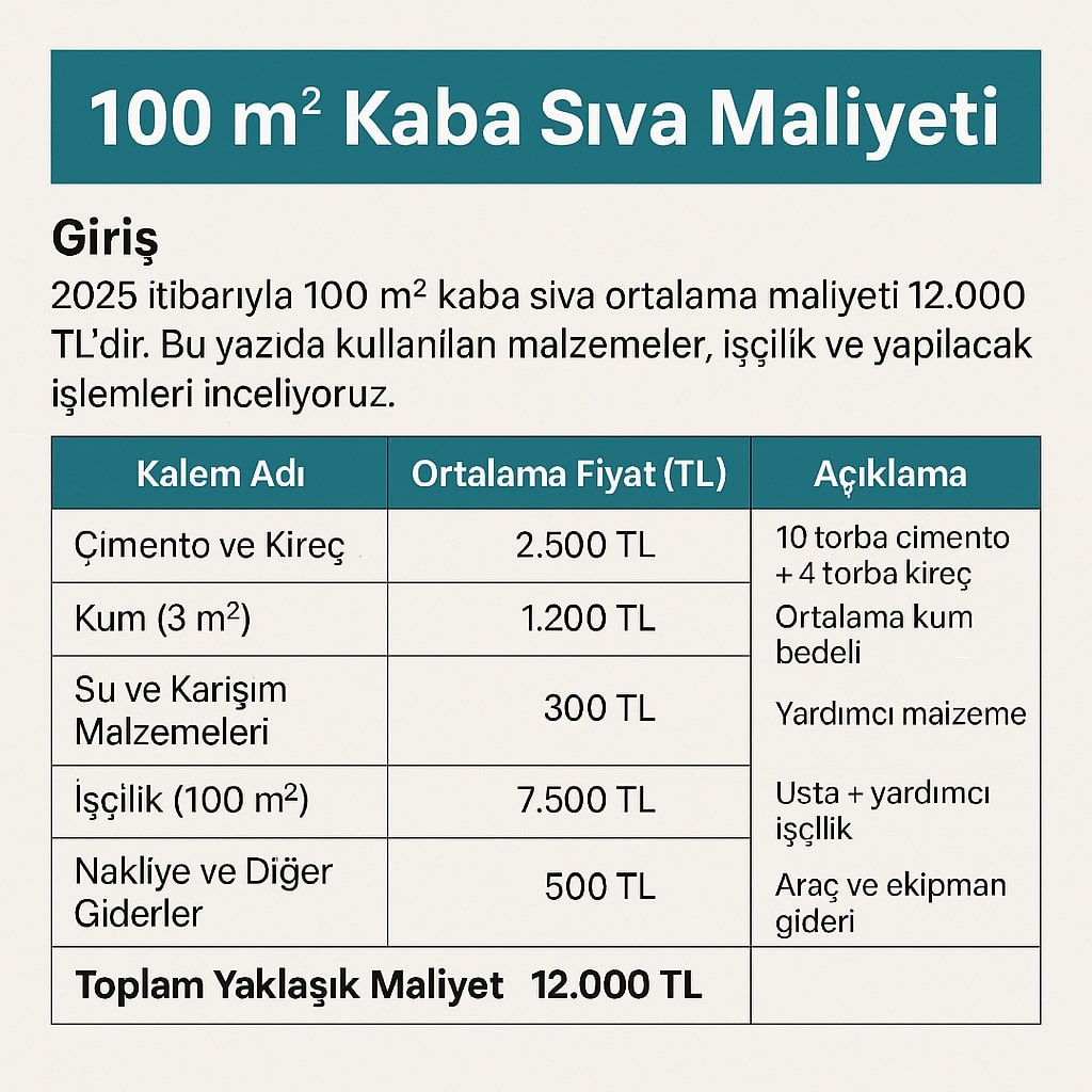 100 m² kaba sıva maliyeti 2025 yılı itibarıyla ortalama 12.000–13.000 TL civarındadır. Fiyat, seçilen malzemeye, işçiliğe ve konuma göre değişebilir. Sağlam bir temel oluşturmak ve uzun ömürlü bir yüzey elde etmek için profesyonel ekiplerle çalışmak, doğru karışım oranlarını kullanmak büyük önem taşır.